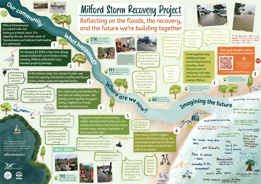 Following the severe weather events of early 2023, Auckland Council’s Tāmaki Makaurau Recovery Office funded a community-led recovery process for Milford. Community Think partnered with the Milford Recovery Group and Milford Residents Association to guide an inclusive, locally driven engagement process.